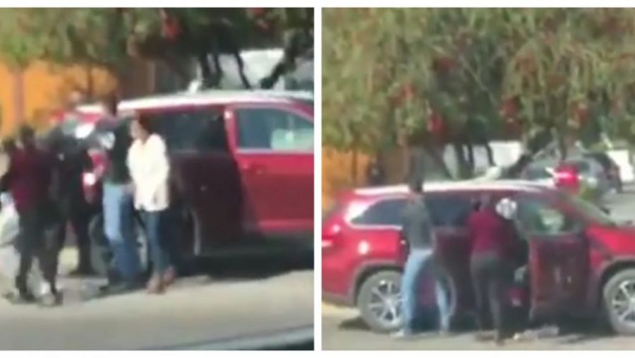 Usuarios de redes sociales compartieron las imágenes donde se observa a sujetos bajan con armas de fuego al menos a cuatro personas de una camioneta color roja y. El automóvil fue interceptado por otra camioneta color azul.