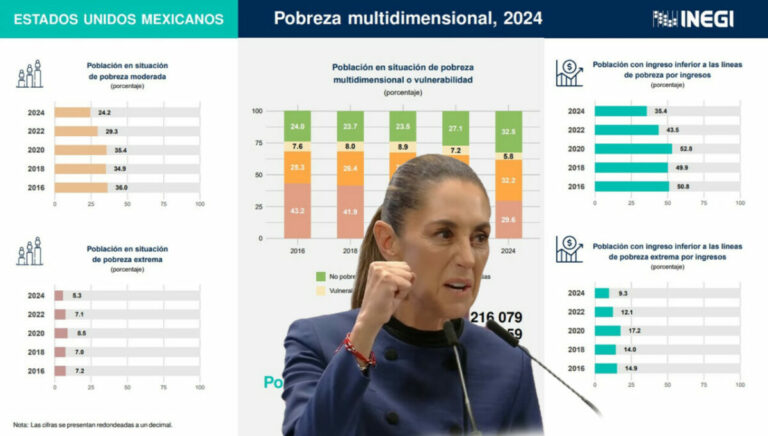 De acuerdo con datos obtenidos de la Encuesta Nacional de Ingresos y Gastos de los Hogares (ENIGH), el entre 2022 y 2024, el porcentaje de la población en situación de pobreza multidimensional a nivel nacional pasó de 36.3% a 29.6%.
