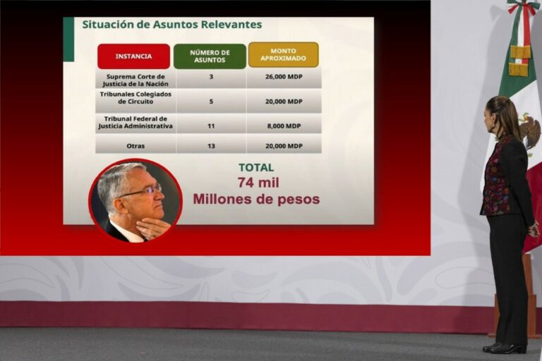 “Este empresario tiene nueve casos en la Corte, esos casos como mencionó aquí la Procuradora fiscal tienen un monto de alrededor de 48 mil millones de pesos. Como lo mencionamos, si él decide pagar antes de que llegara la resolución de la Corte, puede tener los descuentos previstos por el código financiero, de multas y otras características dentro del marco legal. Tres de esos juicios ya tienen asignado al Ministro que va a realizar la ponencia, los otros todavía no tienen. Los otros casos que mencionó hace ya meses la Procuradora están en otros niveles, no han llegado a la Corte todavía, están en tribunales colegiados, en el Tribunal Administrativo. [Son proceso] que con la Ley de Amparo serían más cortos”, destacó la mandataria ante una pregunta.
