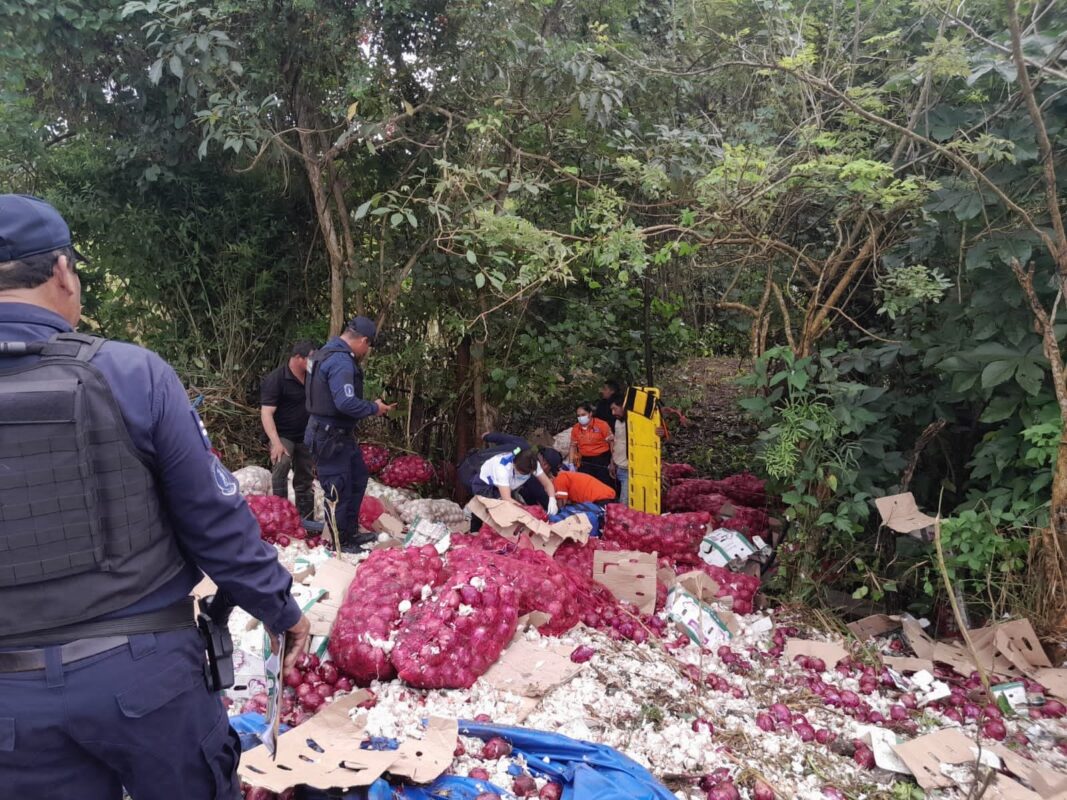 Un camión tipo torton cargado de cebollas y cuyo conductor que transitaba presuntamente a exceso de velocidad, perdió el control, derrapó y volcó sobre la carretera Villahermosa-Frontera, a la altura del kilómetro 23, hecho que fue aprovechado por los pobladores de la zona para rapiñar la carga que se encontraba en el lugar.