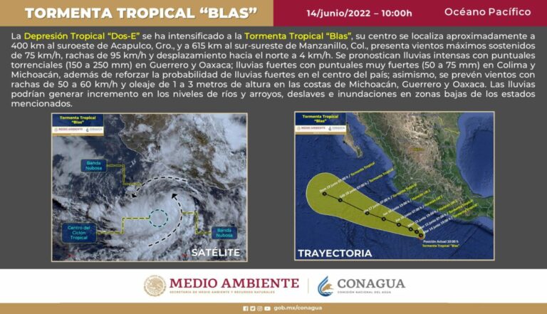 La mañana de este martes, la depresión tropical Dos-E, en el Océano Pacífico, evolucionó a la tormenta tropical “Blas”, con vientos máximos sostenidos de 75 kilómetros por hora (km/h), rachas de 95 km/h y desplazamiento hacia el norte a 4 km/h.