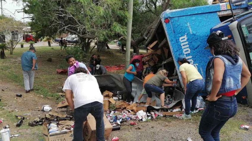 De inmediato al ver la volcadura del camión la gente arribó, pero no se animó a tocar las ‘chelas’, hasta que el mismo encargado de la aseguradora lo permitió, argumentando que para ellos ya no tenía valor debido al accidente.