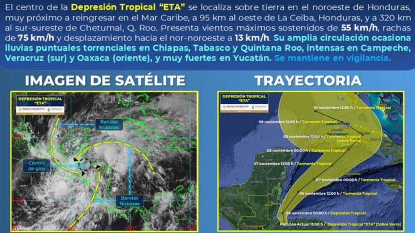 Seguirán las lluvias por la depresión tropical ‘Eta’, en 7 estados del país. Debido a la influencia de la depresión tropical ‘Eta’ en el territorio nacional, se esperan fuertes lluvias para Chiapas, Quintana Roo, Yucatán, Tabasco, Campeche, Veracruz y Oaxaca, esto lo informó la Comisión Nacional del Agua (CONAGUA).