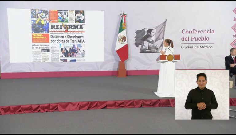 Durante su mañanera, la mandataria federal exhibió la portada del diario Reforma en la que se asegura que un grupo de pobladores “irrumpió” ante la Presidenta cuando viajaba a bordo del tren que llevará al AIFA, el cual hacía su primer trayecto completo.