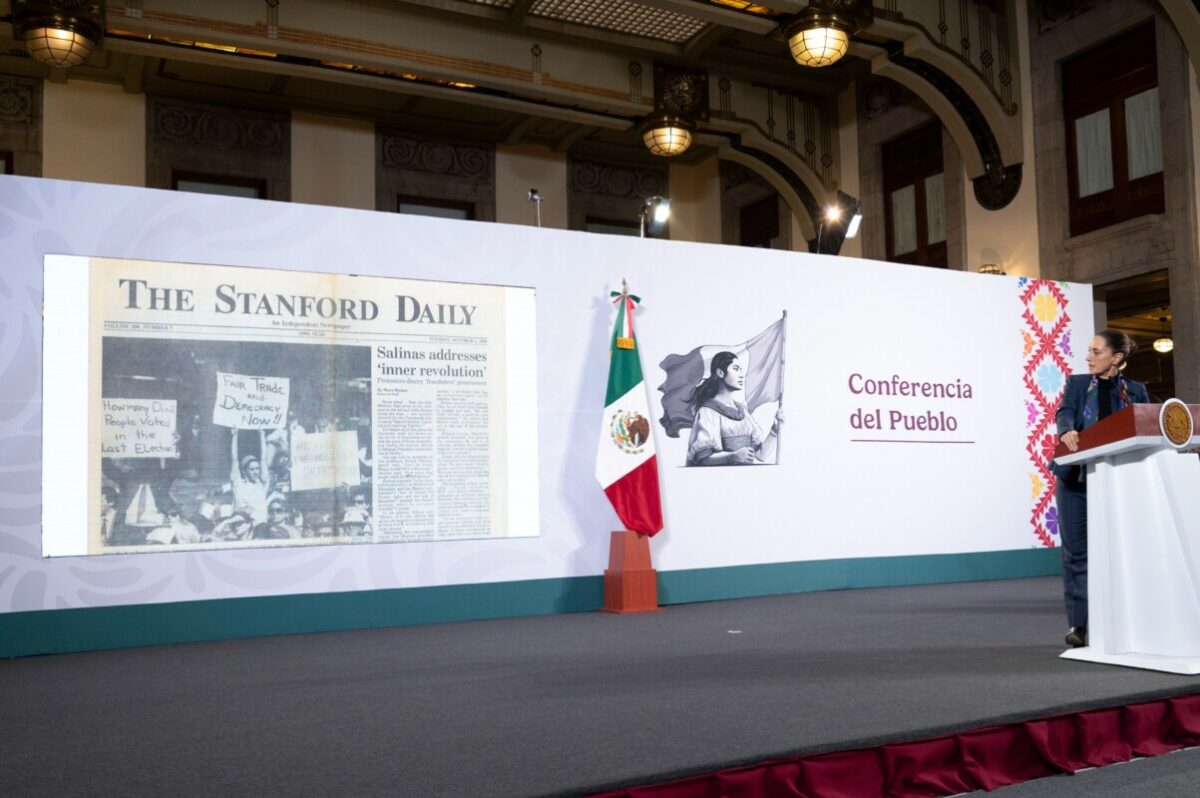Yo, contó, porté uno con la leyenda en inglés “Democracia ya, tratado justo” y en Palacio Nacional se exhibió la foto que de ella publicó en su portada el periódico universitario The Stanford Daily.