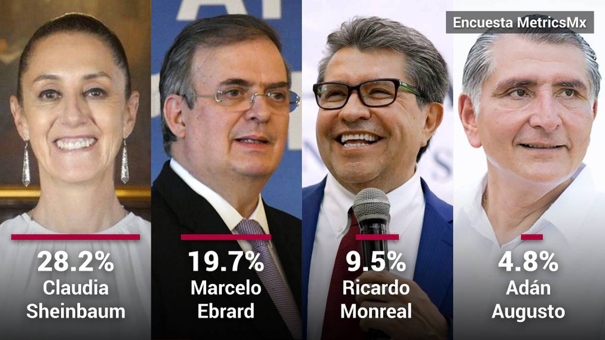Por último, en una hipotética contienda interna de Morena, Claudia Sheinbaum tiene la delantera con 31% de las preferencias, seguida por Marcelo Ebrard con 25%. Ricardo Monreal y Adán Augusto López se encuentran alejados de ellos con preferencias de un dígito.