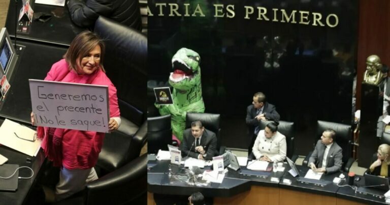 Así, al final la senadora del blanquiazul Xóchitl Gálvez apareció dentro de una botarga con la figura de un dinosaurio, que sostenía la leyenda: “Jurassic Plan”. Con ese disfraz subió al presídium y se plantó detrás del presidente del Senado, Alejandro Armenta, a quien tocó en la espalda y la cabeza, ante la molestia del morenista, quien le exigió respeto y decoro, mientras sus compañeras del PAN le aplaudían el desplante.