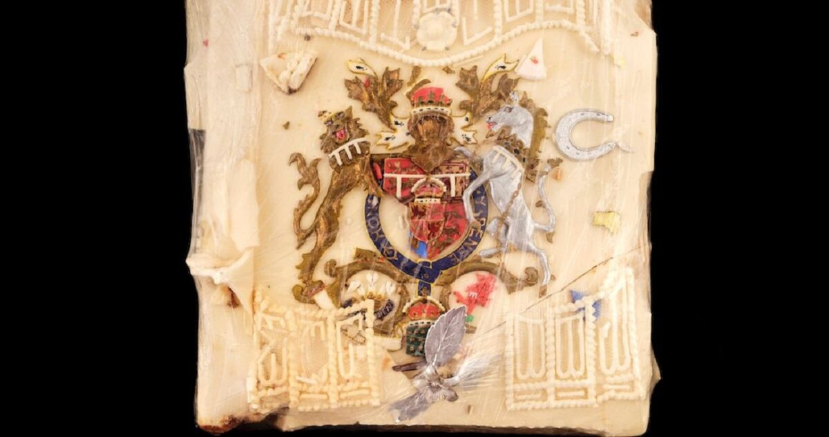 El trozo congelado es de uno de los 23 pasteles de boda oficiales que se hicieron para celebrar el matrimonio del heredero al trono británico y su tímida esposa de 20 años el 29 de julio de 1981. Tiene una base de mazapán y una cubierta azucarada con forma del escudo de armas coloreada de dorado, rojo, azul y plata en la parte superior.