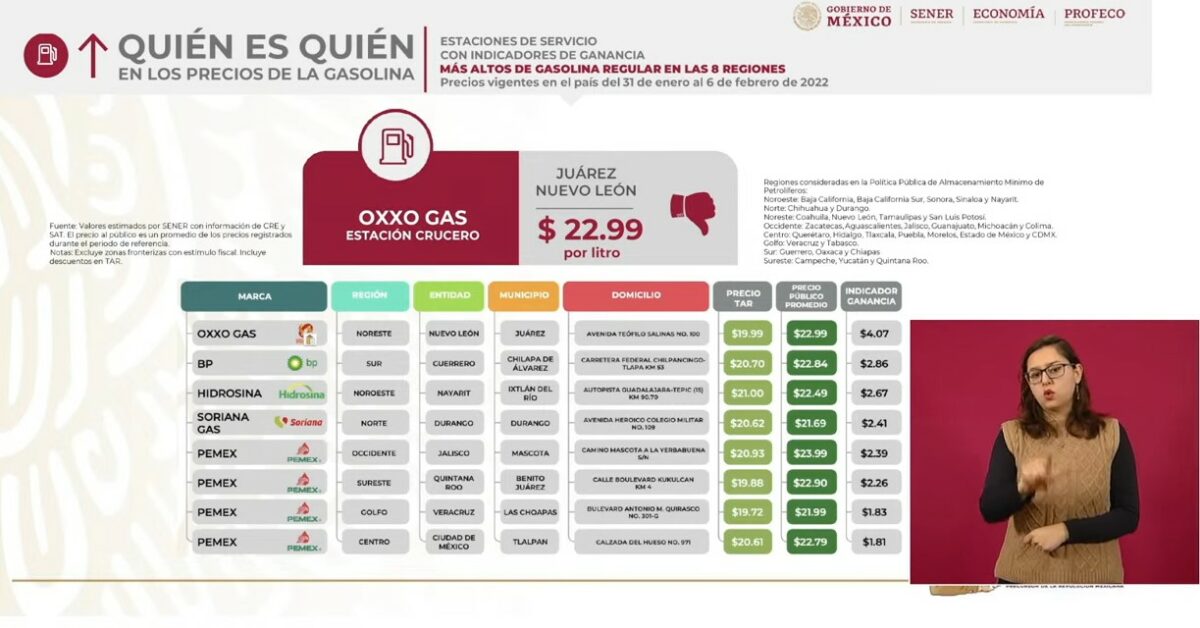Sobre el balance de precios promedio de la semana pasada, detalló que el litro de gasolina regular se ubicó en 21.02 pesos, en 23 pesos la Premium, y en 22.23 pesos el diésel.