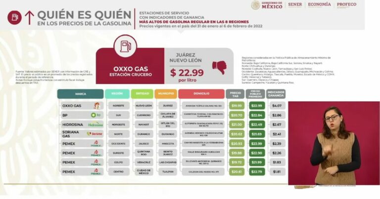 Sobre el balance de precios promedio de la semana pasada, detalló que el litro de gasolina regular se ubicó en 21.02 pesos, en 23 pesos la Premium, y en 22.23 pesos el diésel.