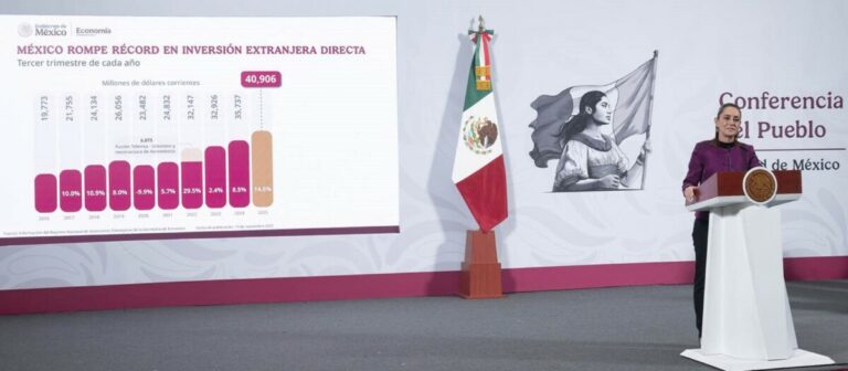 La presidenta Claudia Sheinbaum informó que en el tercer trimestre del año la Inversión Extranjera Directa (IED) en México alcanzó 40,906 millones de dólares, lo que representa un aumento de 14.5% respecto al mismo periodo del año anterior y el monto más alto de un tercer trimestre desde que existe registro.