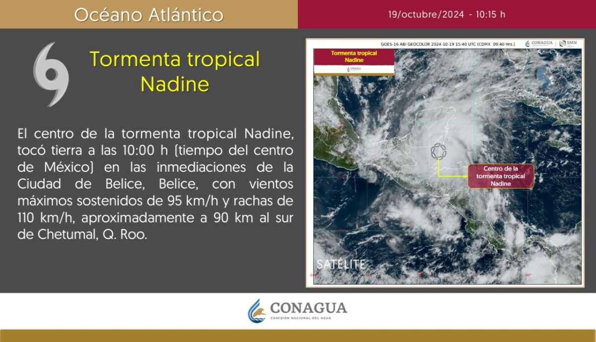 A las 10:00 horas, tiempo del centro de México, el centro de la tormenta tropical Nadine tocó tierra en inmediaciones de la Ciudad de Belice, Belice, aproximadamente a 90 kilómetros al sur de Chetumal, Quintana Roo, informó el Servicio Meteorológico Nacional.