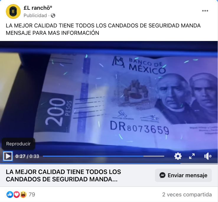 El perfil de Facebook, denominado “El Rancho”, promociona mediante el pago de publicidad, billetes de circulación corriente en México los cuales aseguran son “de la mejor calidad…y tienen todos los candados de seguridad”.