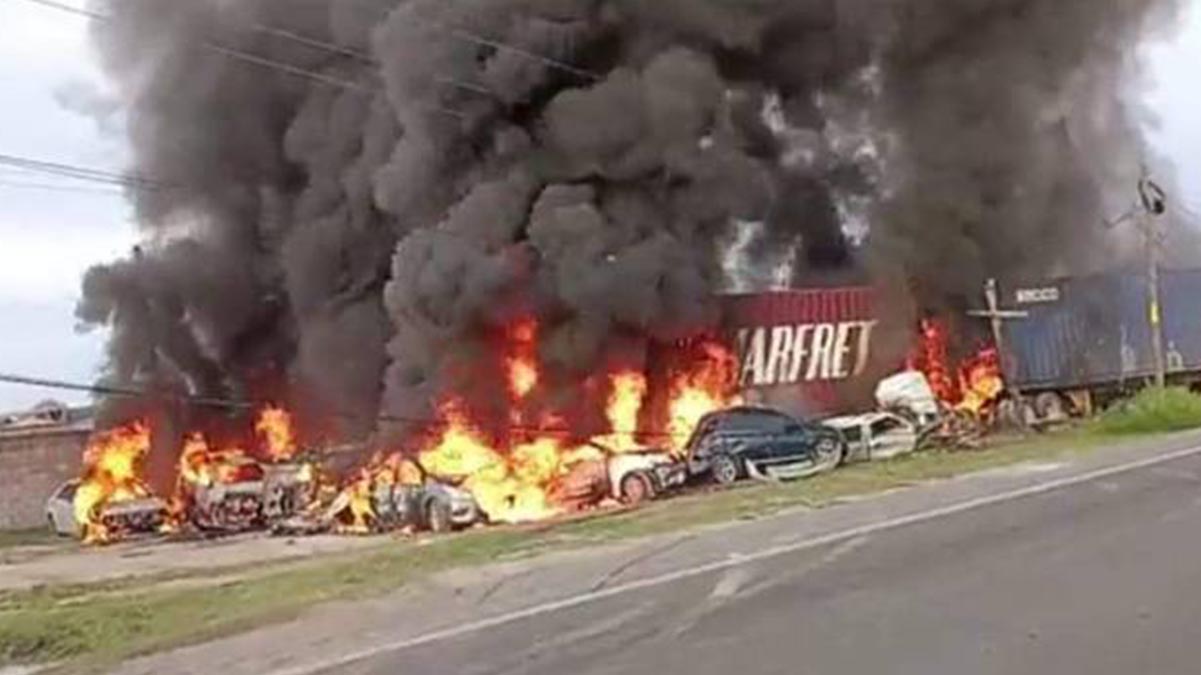 Tras perder el control e impactarse contra varios vehículos que se encontraban estacionados afuera de una empresa en Tabasco, un traíler destruye por lo menos 25 automóviles que estallaron en llamas y quedaron reducidos a escombros.