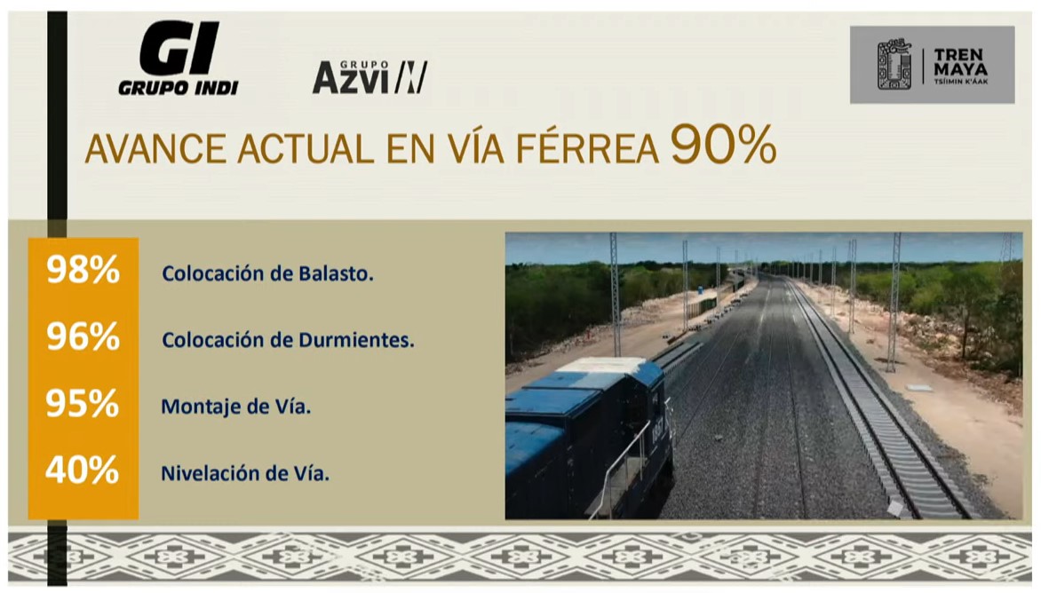 Por su parte, Manuel Muñozcano, director general de Azvindi dijo que se tiene un avance de 97 por ciento por lo que, aseguró, se ha avanzado sin contratiempos y se proyecta concluir conforme a lo comprometido. Mencionó que en el caso de la colocación de la vía férrea, el avance alcanza ya el 95 por ciento.