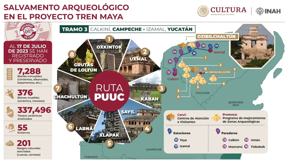 Por su parte, el director del Instituto Nacional de Antropología e Historia, Diego Prieto destacó que en el tramo 3 se ha concluido prácticamente las tareas de investigación y análisis de los vestigios que se localizaron entre Calkini e Izamal. Destacó que después del tramo 7, donde sorprendentemente se localizaron una enorme cantidad de vestigios, el tramo 3 es el que más material tuvo en los primeros cuatro tramos.