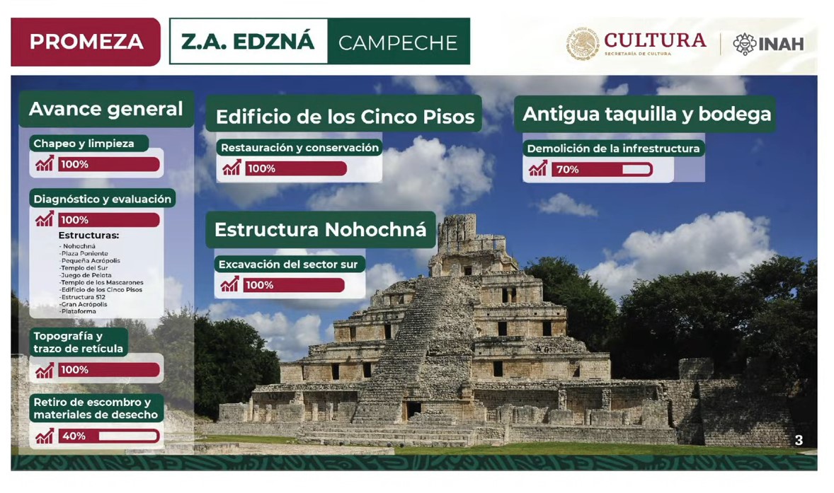 En tanto, Diego Prieto Hernández, director general del Instituto Nacional de Antropología e Historia (INAH), dijo que se realizan acciones en dos zonas arqueológicas: En Edzná continúa la edificación del centro de atención a visitantes, para ampliar la capacidad de recepción, mientras que en Xcalumkín, una zona “poco conocida”, están por iniciar los trabajos arqueológicos de excavación.