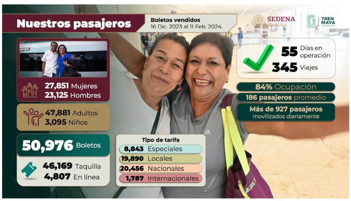 En 55 días de operación, el Tren Maya ha transportado a 50 mil 976 pasajeros en las rutas Palenque-Campeche-Cancún, informó el general Óscar David Lozano Águila, director general de la empresa a cargo del proyecto que es dependiente de la Secretaría de la Defensa Nacional.