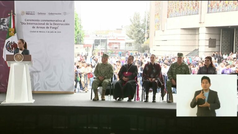Al encabezar una ceremonia conmemorativa por el Día Internacional de la Destrucción de Armas de Fuego, declarado por la ONU desde 2001, Sheinbaum afirmó que el camino hacia la felicidad es la fraternidad y la construcción de una sociedad justa, libre y democrática. “Sí al desarme, sí a la paz”, proclamó la mandataria acompañada de funcionarios federales y locales, así como de jerarcas de la iglesia católica. Destacó que desde el inicio del año, se han retirado más de dos mil armas, en un acto que, más allá del número, representa una oportunidad para salvar vidas y sanar el tejido social.