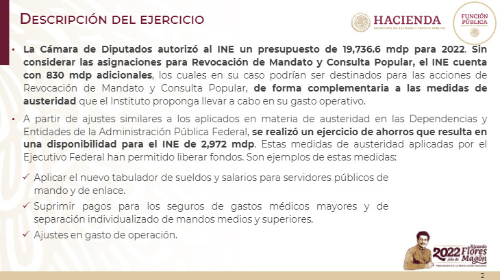 “Del ejercicio que hicimos tanto la Función Pública, como la Secretaría de Hacienda, estimamos que al 31 de diciembre, tendrá un saldo disponible que puede dar para la Revocación de Mandato por 869 millones de pesos”, comentó. “Ese saldo disponible es una estimación que hicimos nosotros y estamos descontando todo el presupuesto comprometido que pudiera tener el INE al cierre del ejercicio presupuestal”.