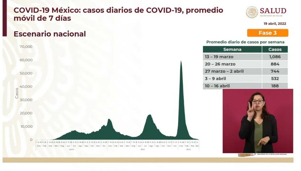 El promedio de contagios diarios por semana va de la siguiente forma: mil 086 (13 al 19 de marzo), 884 (20 al 26 de marzo), 744 (27 de marzo al 2 de abril), 532 (3 al 9 de abril), 188 (10 al 16 de abril).