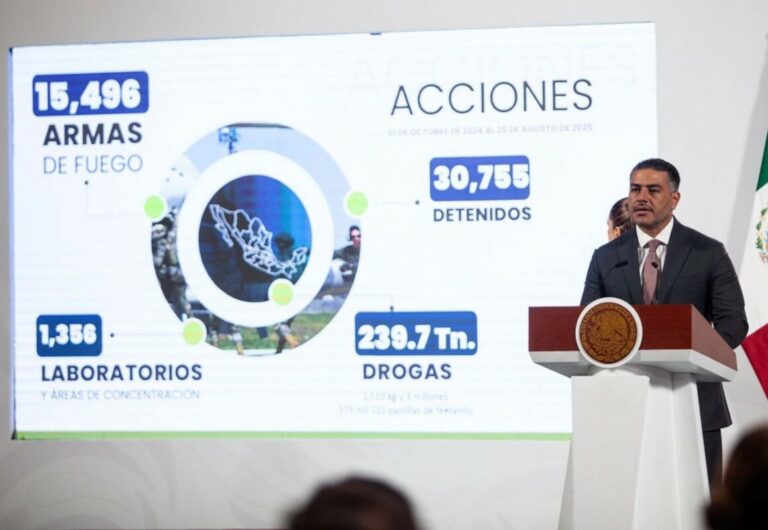 Omar Garcia Harfuch, secretario de Seguridad y Protección Ciudadana, indicó que del 1 de octubre de 2024 al 25 de agosto de 2025 han detenido a 30 mil 700 personas; asegurado 15 mil 496 armas de fuego y cerca de 240 toneladas de droga. Entre ellas, 3.5 millones de pastillas de fentanilo en 21 estados, además de que el Ejército y la Marina han inhabilitado mil 356 laboratorios dedicados a la producción de metanfetaminas y asegurado más de 47 toneladas de cocaína en acciones marítimas.