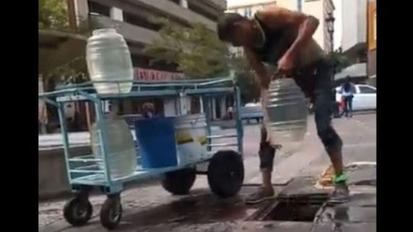 A través del video se puede ver cómo un hombre se acerca a un registro que está abierto en la plaza San Francisco, en el Centro Histórico de Guadalajara, con un carrito y algunos recipientes para recolectar el agua.