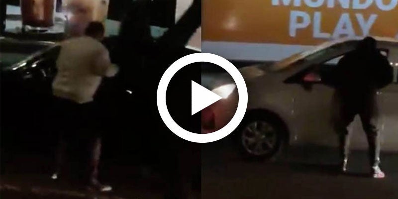 En la escena obtenida por un automovilista, se puede apreciar a un hombre vestido con sudadera en color gris y pantalón oscurc amaga al conductor de un vehículo negro detenido en el tráfico.