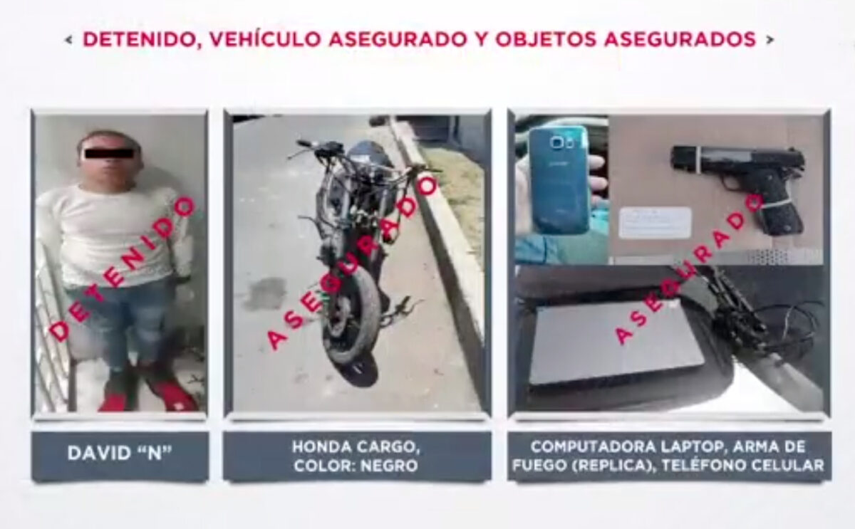 A los detenidos, identificados como David “N” y un menor de edad, se les aseguraron una motocicleta Honda Cargo color negro, una laptop, una replica de arma de fuego y un teléfono celular.