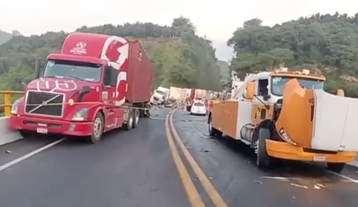 Una brutal carambola que se registró entre por lo menos seis tractocamiones en el estado de Jalisco, dejó como saldo preliminar por lo menos un muerto y el cierre de la autopista Acatlán de Juárez-Colima.
