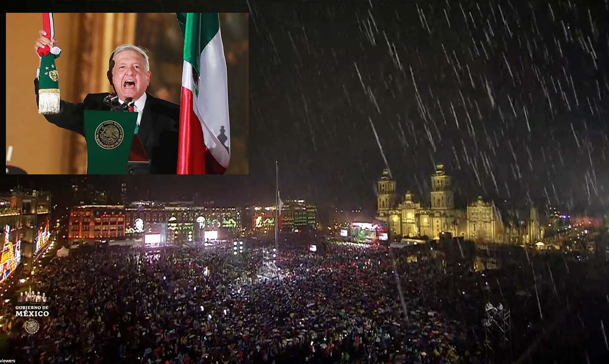 El mal clima presagiaba la ruina del evento que año tras año esperan millones de mexicanos, pues hasta entrada la noche, el agua continuaba cayendo a cántaros sobre un zócalo cubierto de personas con sombrillas.
