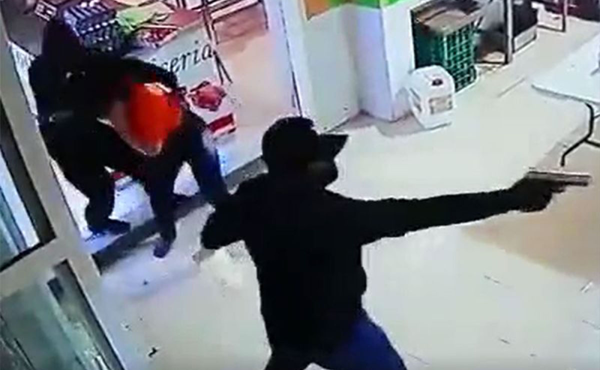 Sin embargo el testigo amenaza con lanzar una silla, pero el hombre armado acciona su arma y dispara al suelo.