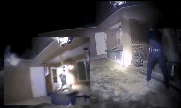 Instantes después se observa que alguien abre la puerta del domicilio y los policías alumbran con una lámpara al residente, contra quien abren fuego de inmediato sin darle oportunidad a decir una palabra. Uno de los uniformados al ver que el hombre salía gritó: “¡Oiga, manos arriba!”, y justo en ese momento los tres policías de Farmington empezaron a disparar a quemarropa.