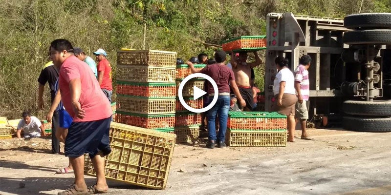Video: Rapiñan 15 toneladas de pollos en un tráiler volcado en JMM; la gente se preocupó más por cargar las aves, que auxiliar al chofer.