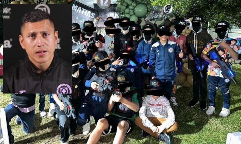 En la fiesta organizada para el menor el fin de semana pasado, los menores aparecieron vestidos como sicarios, cargando armas y con gorras con la leyenda “chapiza”, pero varios de ellos también lucían mezclado con el outfit de narco, el uniforme del equipo Cruz Azul.
