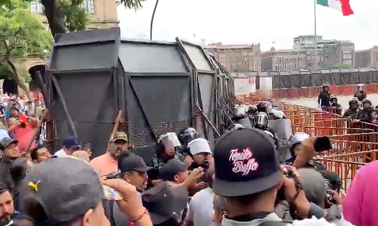 Durante el enfrentamiento con los uniformados en el epicentro de la capital, los docentes derribaron vallas que bloqueaban el acceso a Palacio Nacional, además de causar daños en cristales y vehículos pertenecientes a la SSC.