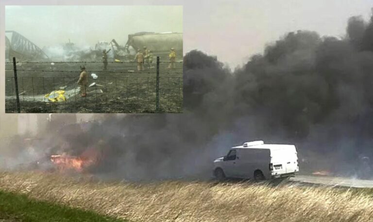 El vendaval de polvo, redujo al mínimo la visibilidad, provocando una monumental carambola que dejó decenas de vehículos destrozados, algunos de ellos consumidos por las llamas.