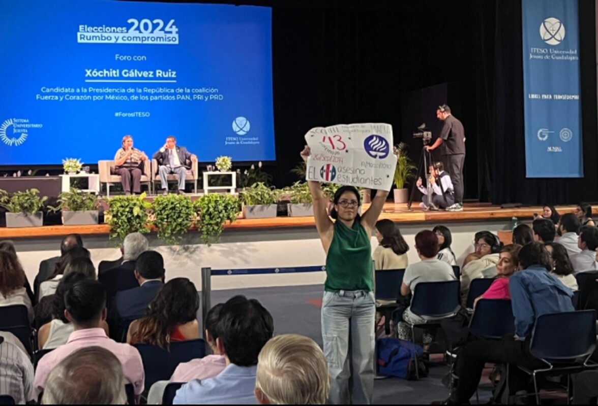 Mientras la candidata presidencial Xóchitl Gálvez presentaba sus propuestas de campaña, una estudiante del Instituto Tecnológico y de Estudios Superiores de Occidente (ITESO) levantó una cartulina en la que se leía “PRIAN asesina a estudiantes”.