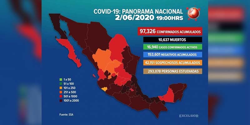 Ya son 97 mil 326 casos positivos de Covid-19 en México.- Autoridades de la Secretaría de Salud federal (Ssa) informaron que el número de casos positivos por Covid-19 incrementaron a 97 mil 326 en México.